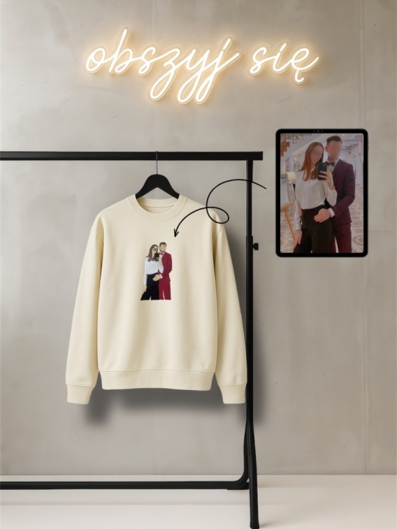 Bluza z personalizowanym haftem postaci to wyjątkowy sposób na uwiecznienie ważnych osób i chwil. Może to być haft jednej osoby, pary, a nawet trzech osób – wykonany na podstawie zdjęcia i przeniesiony na wysokiej jakości bluzę wykonaną z mieszanki wysokogatunkowej bawełny i poliestru, co zapewnia komfort noszenia, trwałość i odporność na codzienne użytkowanie.. To nie tylko ubranie – to osobista pamiątka, która wyróżnia się stylem i emocjami.